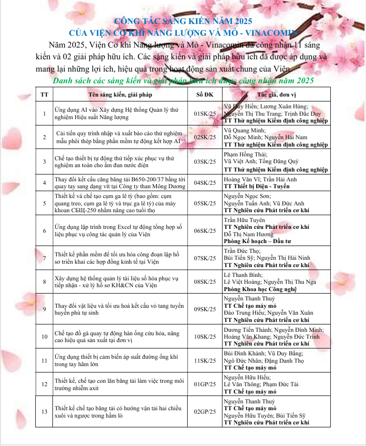 CÔNG TÁC SÁNG KIẾN NĂM 2025 CỦA VIỆN CƠ KHÍ NĂNG LƯỢNG VÀ MỎ – VINACOMIN
