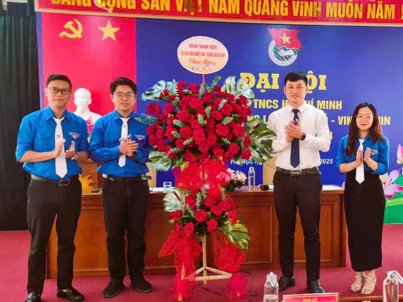 Đ/c Lê Anh Hoàng – Phó Bí thư Đoàn Thanh niên Tập đoàn, tặng hoa chúc mừng Ban chấp hành Đoàn Viện nhiệm kỳ 2022 – 2025