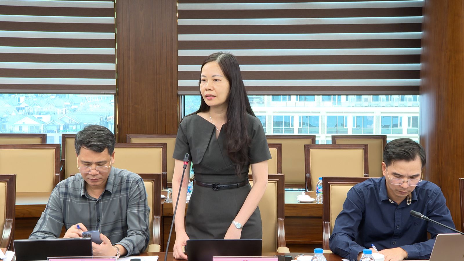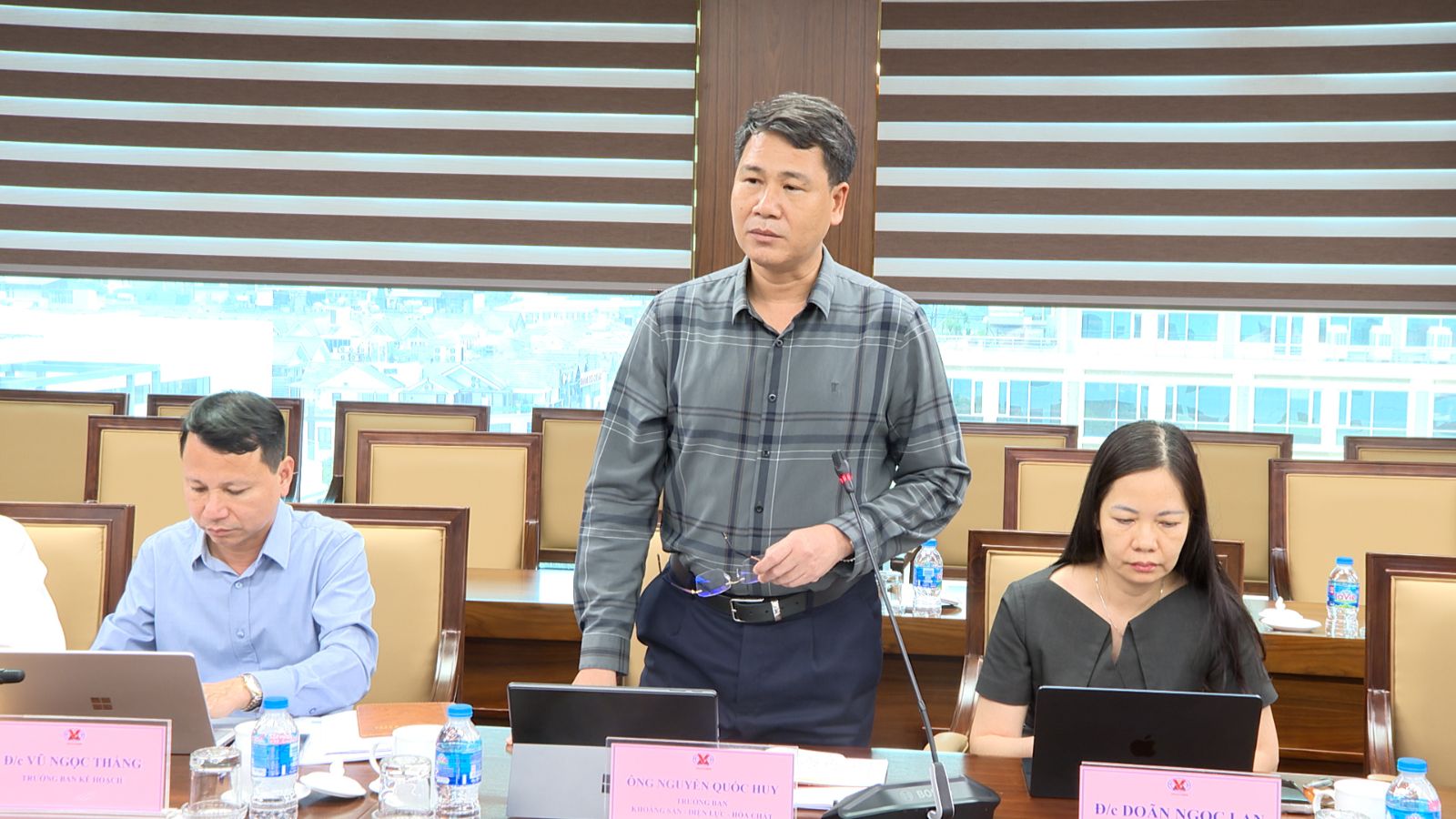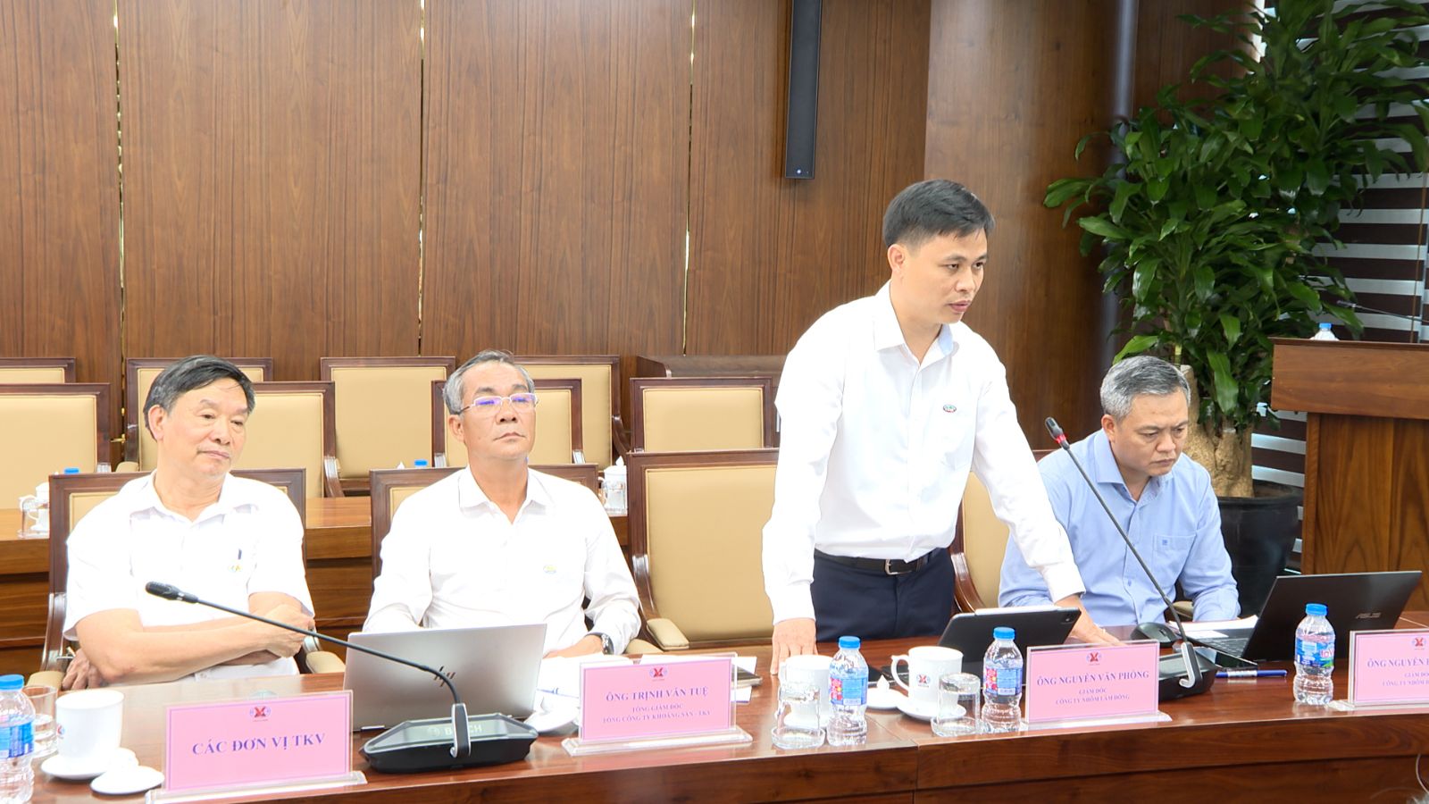 Trưởng Ban Vật tư – Thương mại Tập đoàn Đinh Tiến Hòa trình bày báo cáo chi tiết về tình hình thực hiện công tác tiêu thụ sản phẩm khoáng sản.