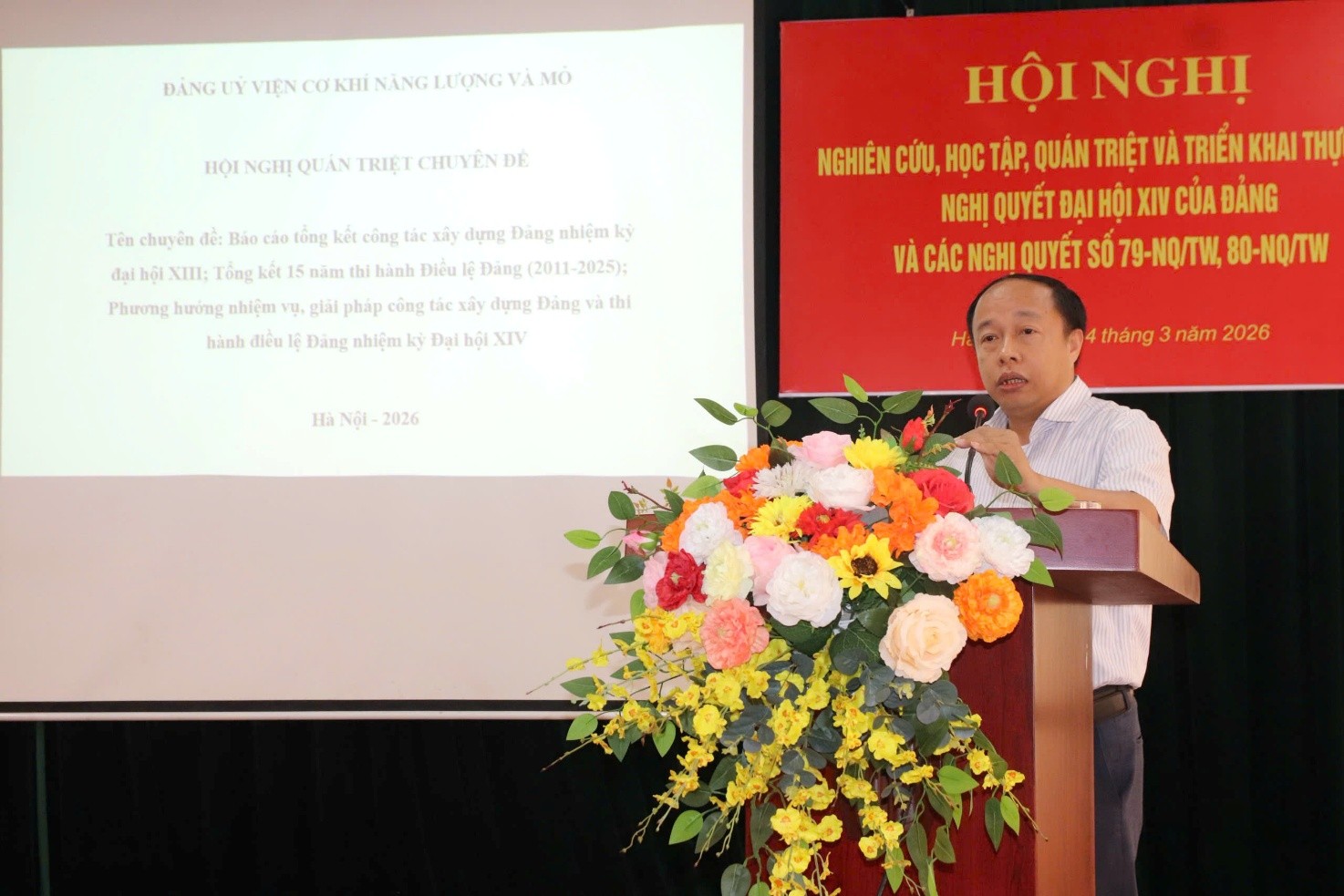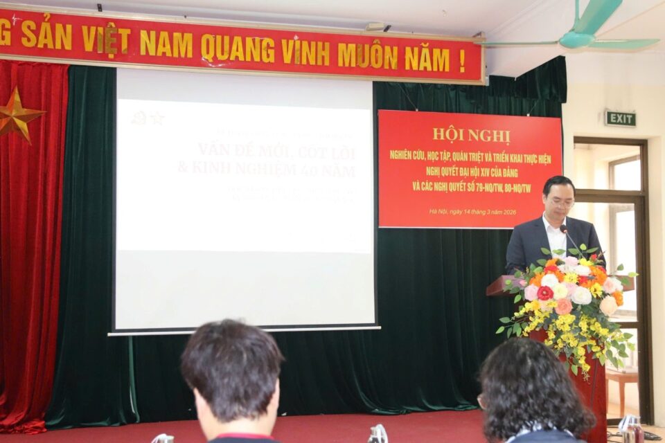 Trong không khí thi đua sôi nổi và tinh thần trách nhiệm cao, thực hiện Kế hoạch số 19-KH/ĐU ngày 10/02/2026 của Đảng ủy Tập đoàn Công nghiệp Than – Khoáng sản Việt Nam, ngày 14/3/2026, tại Trụ sở Viện, Đảng bộ Viện Cơ khí Năng lượng và Mỏ đã long trọng tổ chức Hội nghị nghiên cứu, học tập, quán triệt và triển khai thực hiện Nghị quyết Đại hội XIV của Đảng và các Nghị quyết số 79-NQ/TW, 80-NQ/TW. Đây không chỉ là một đợt sinh hoạt chính trị sâu rộng mà còn là kim chỉ nam cho mọi hành động của mỗi đảng viên, cán bộ, công nhân viên trong toàn Viện.